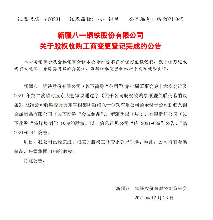 新疆八一鋼鐵股份有限公司關於股權收購工商變更登記完成的公告
