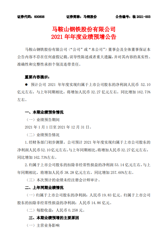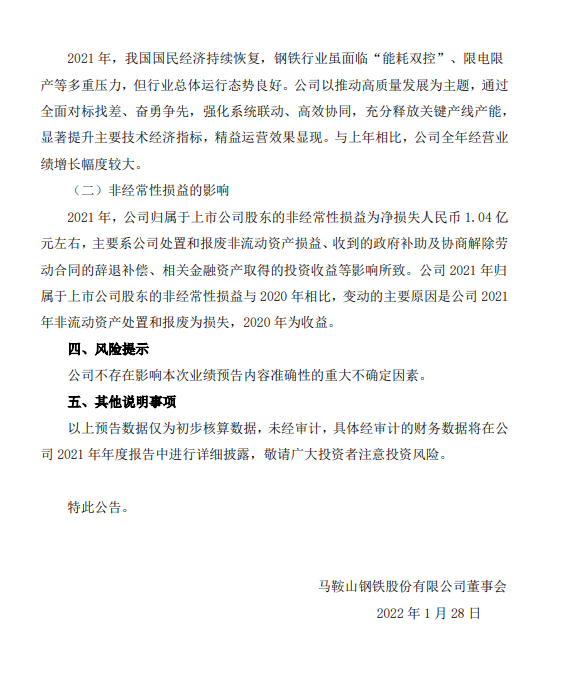 馬鞍山鋼鐵股份有限公司2021年年度業績預增公告