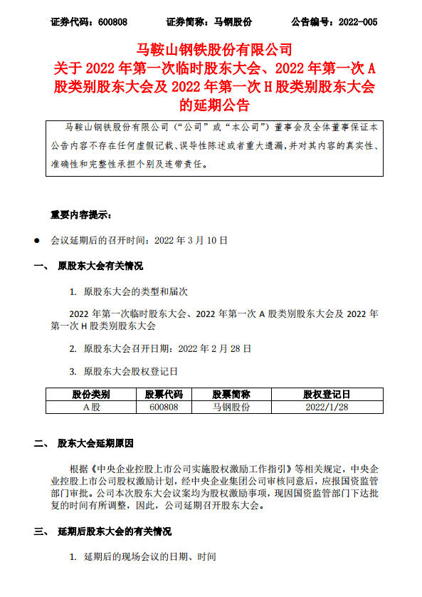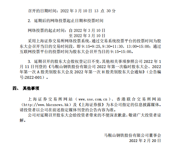 馬鞍山鋼鐵股份有限公司關於2022年第一次臨時股東大會、2022年第一次A股類別股東大會及2022年第一次H股類別股東大會的延期公告