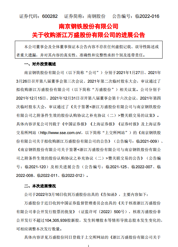 南京鋼鐵股份有限公司關於收購浙江萬盛股份有限公司的進展公告