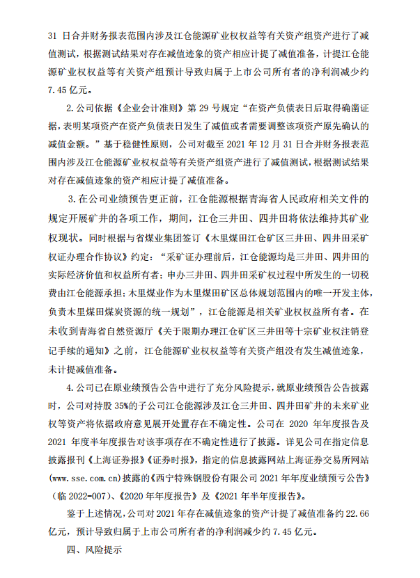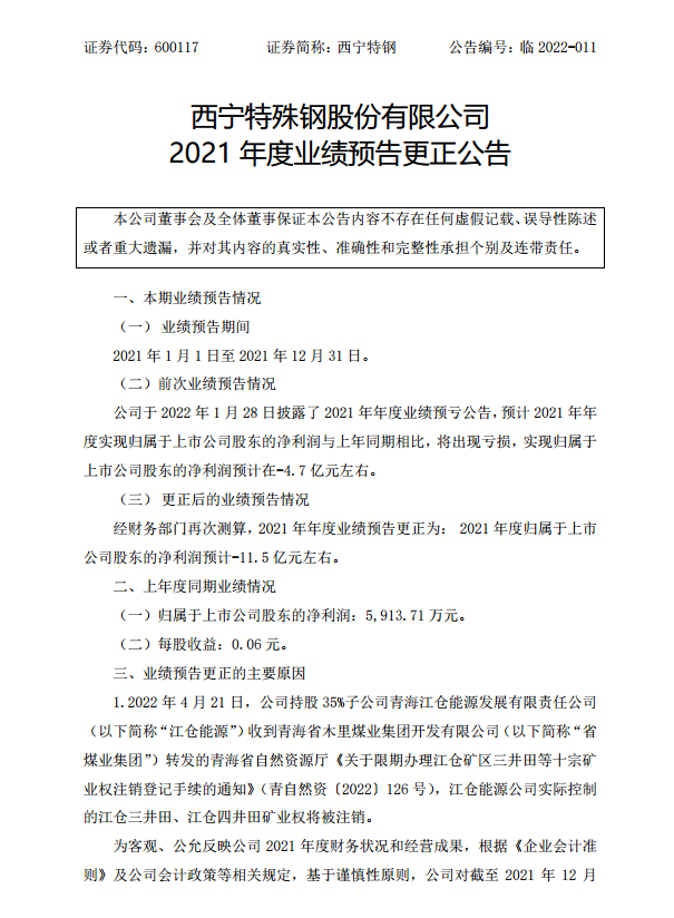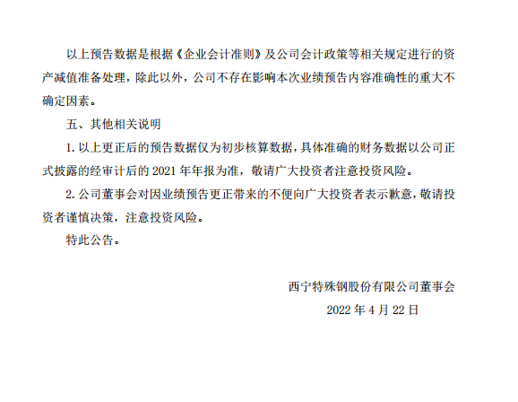 西寧特殊鋼股份有限公司2021年度業績預告更正公告