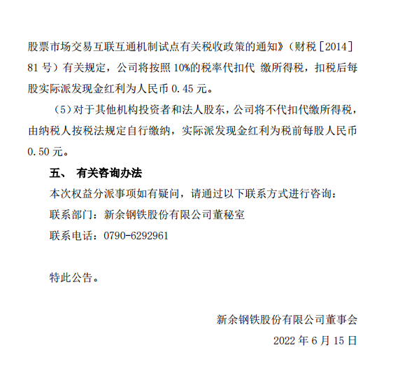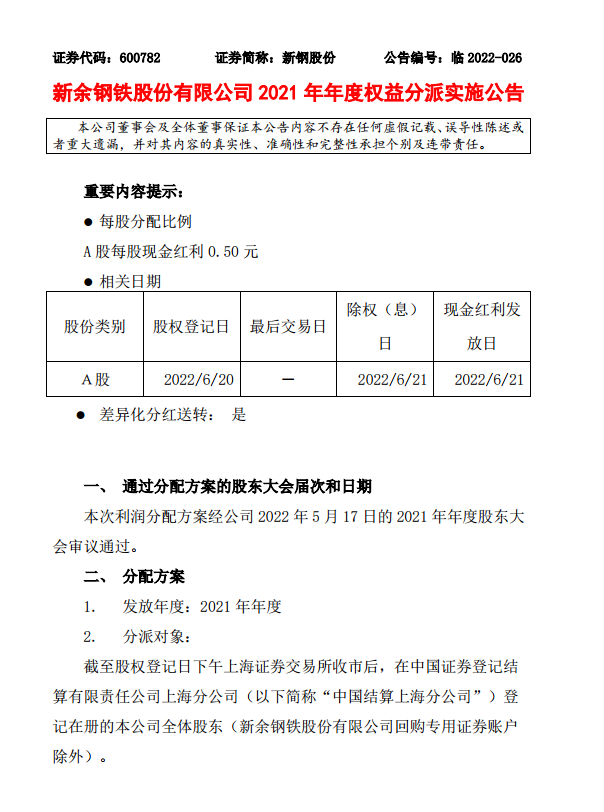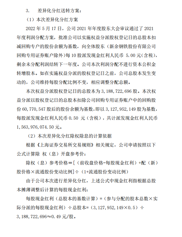 新鋼股份2021年度權益分派實施公告