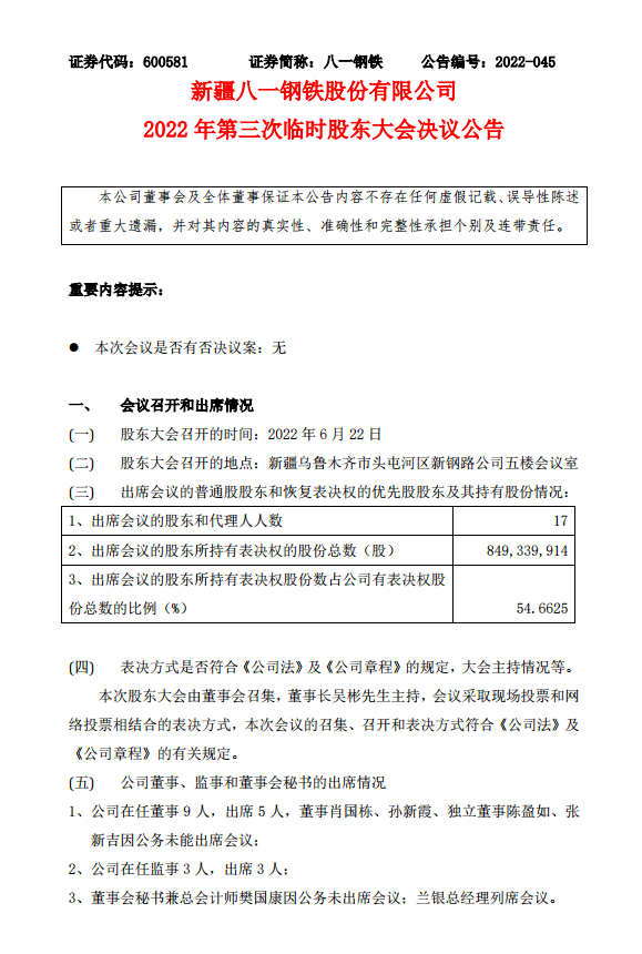 新疆八一鋼鐵股份有限公司2022年第三次臨時股東大會決議公告