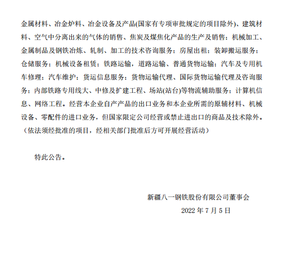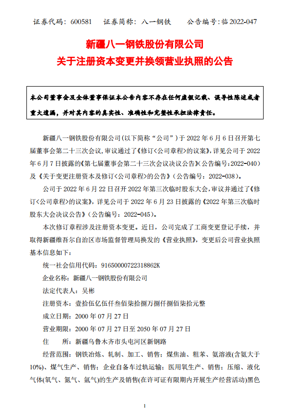八一鋼鐵關於完成注冊資本變更並換領營業執照的公告