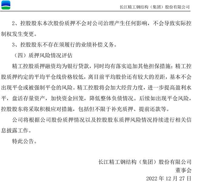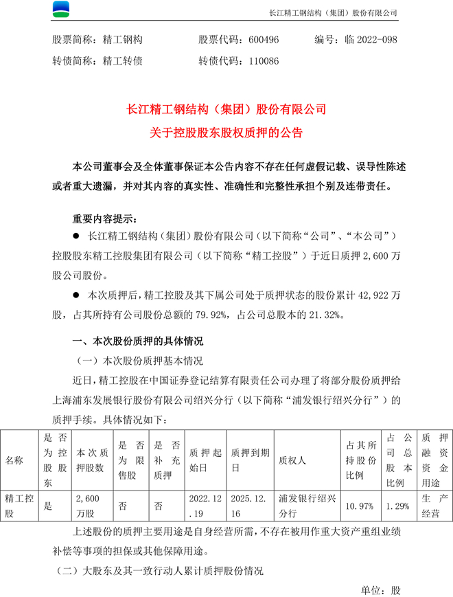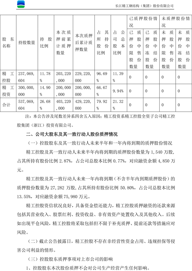 精工鋼構:精工鋼構關於控股股東股權質押的公告