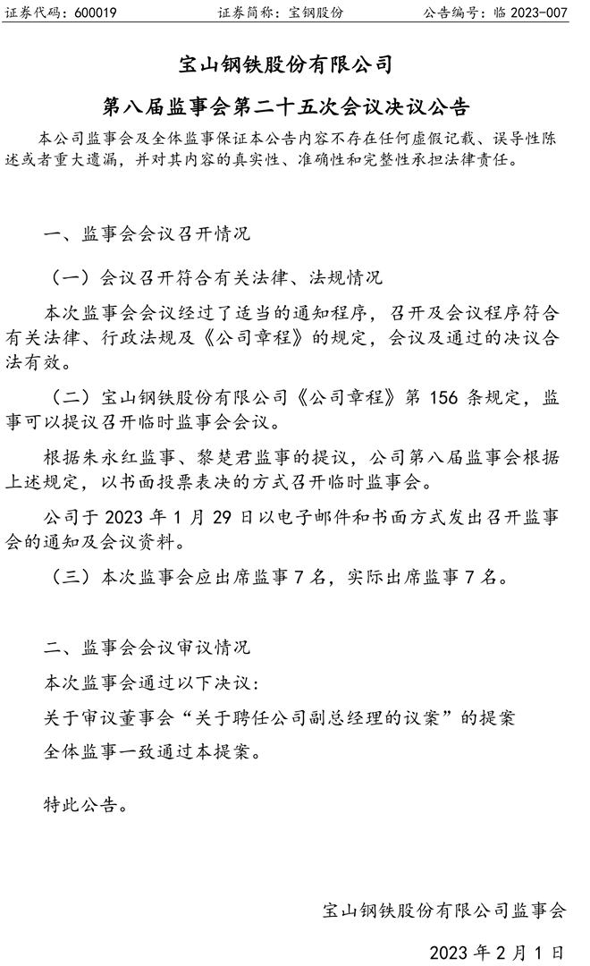 寶鋼股份:寶鋼股份第八屆監事會第二十五次會議決議公告