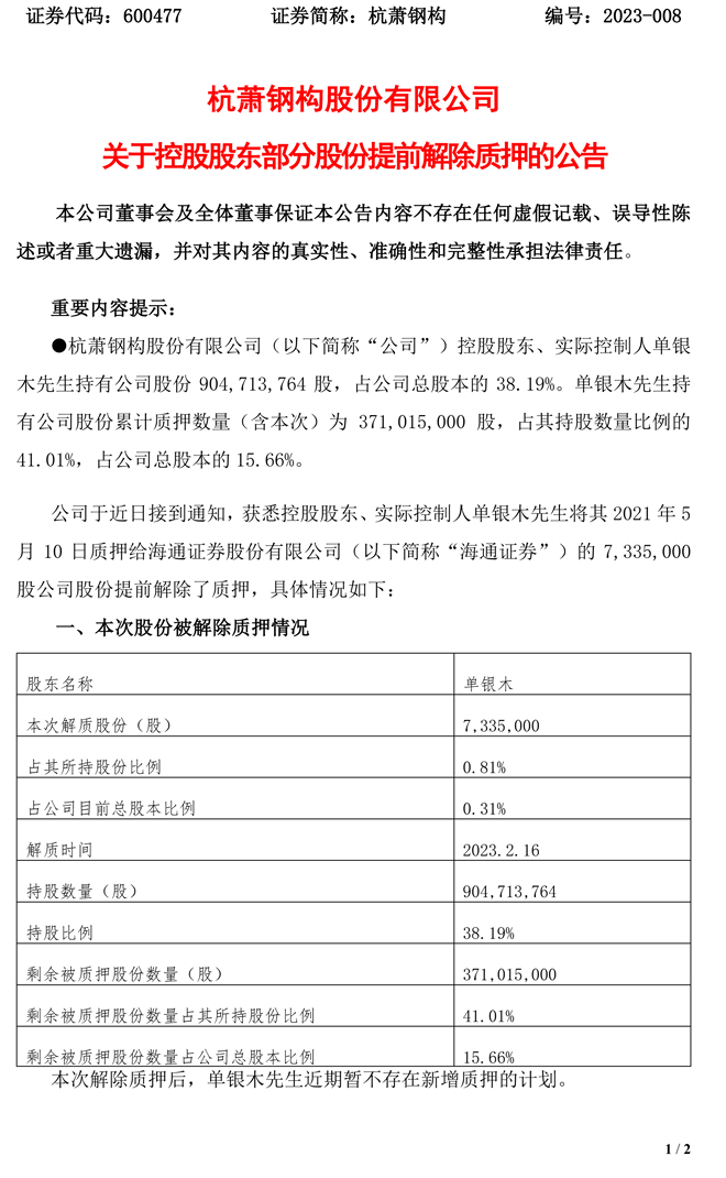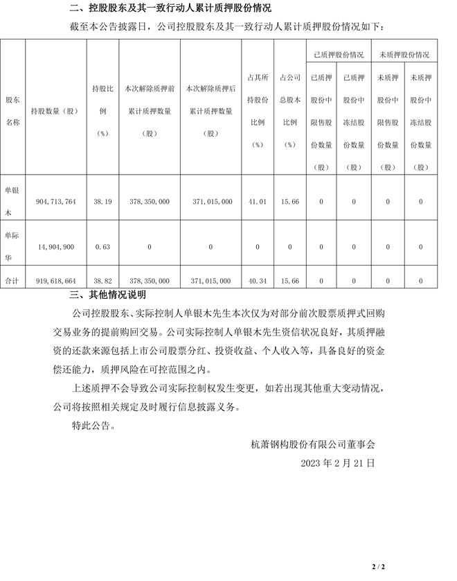 杭蕭鋼構:杭蕭鋼構關於控股股東部分股份提前解除質押的公告