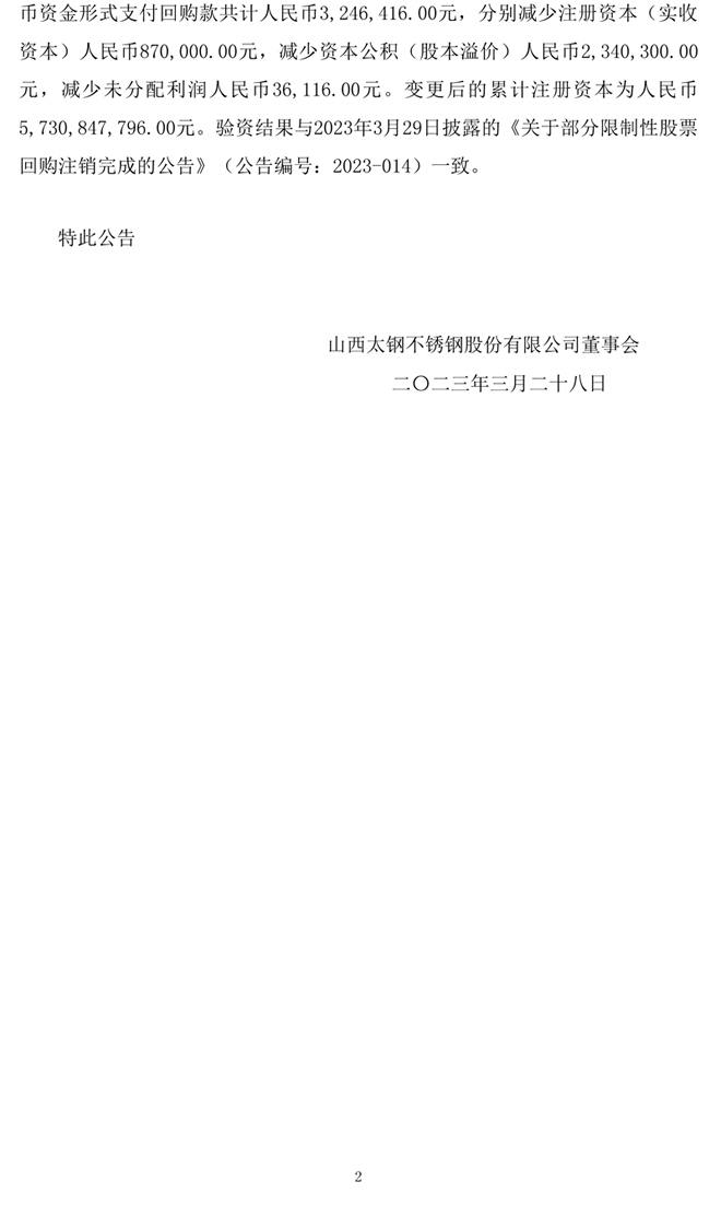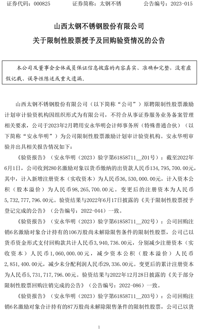 太鋼不鏽:關於限製性股票授予及回購驗資情況的公告