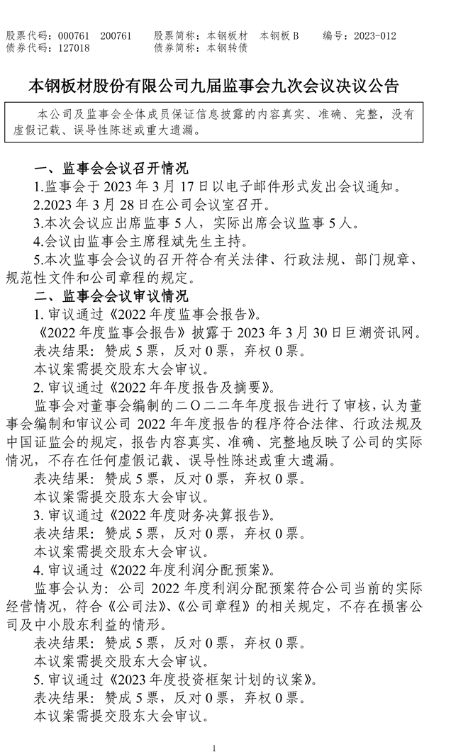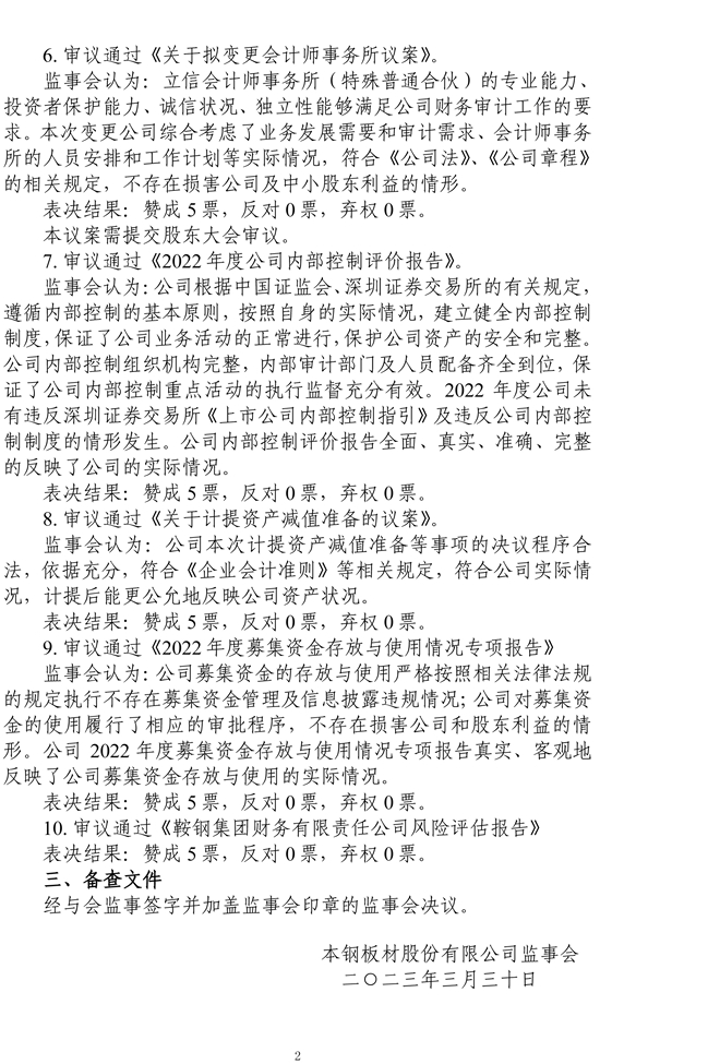 本鋼板材:監事會決議公告
