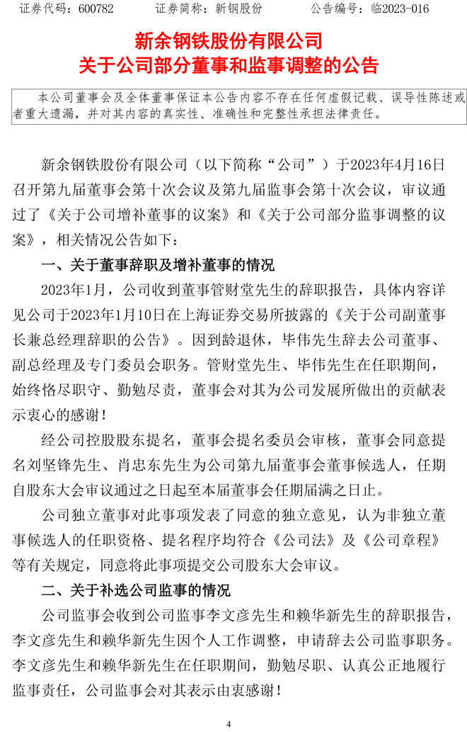 新鋼股份:新鋼股份關於董事和監事調整的公告