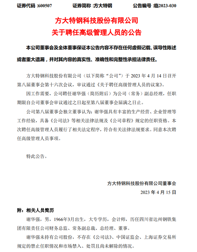 方大特鋼:方大特鋼關於聘任高級管理人員的公告