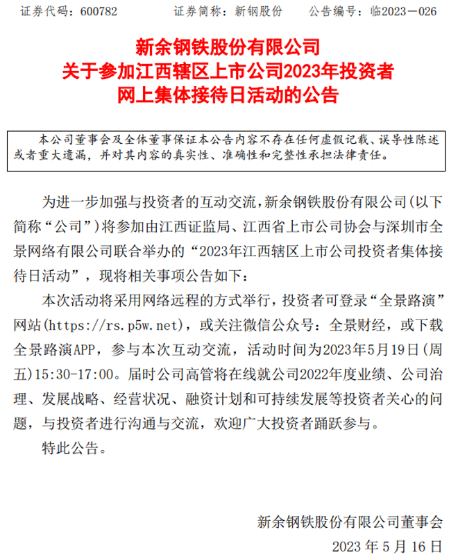 新鋼股份:新鋼股份關於參加江西轄區上市公司2023年投資者網上集體接待日活動的公告