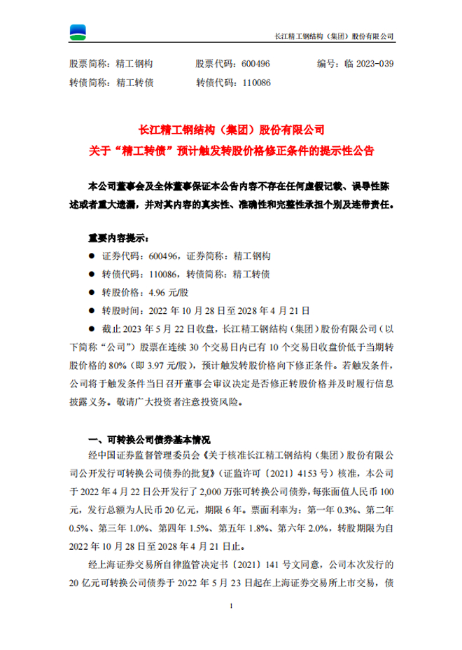 精工鋼構:精工鋼構關於“精工轉債”預計觸發轉股價格修正條件的提示性公告