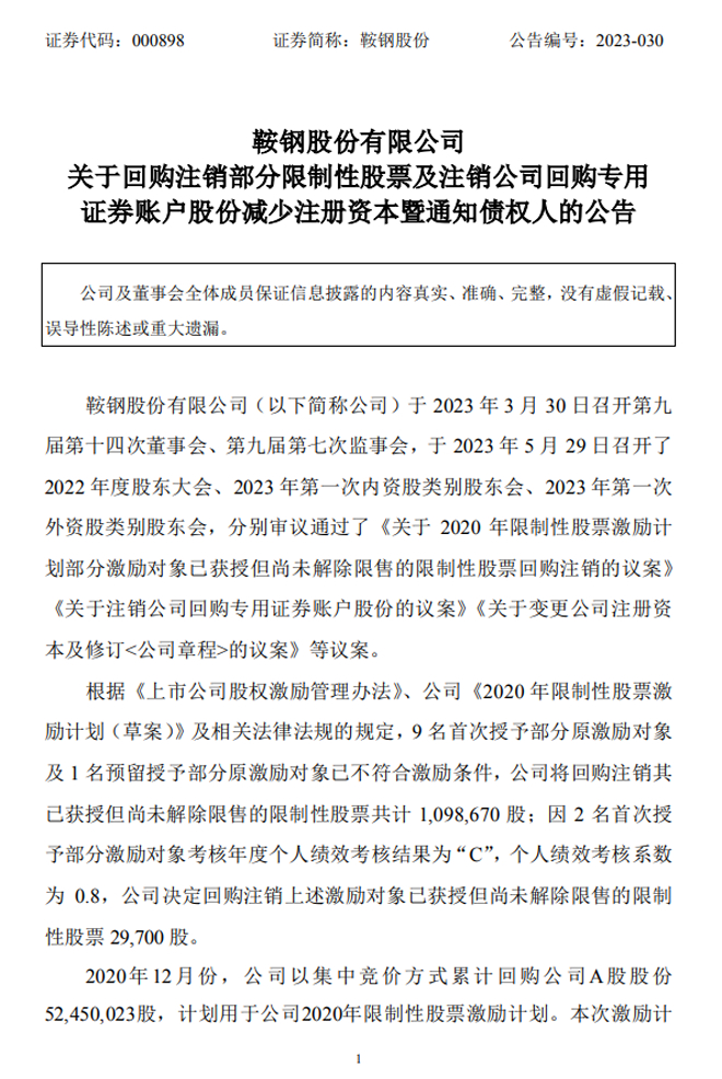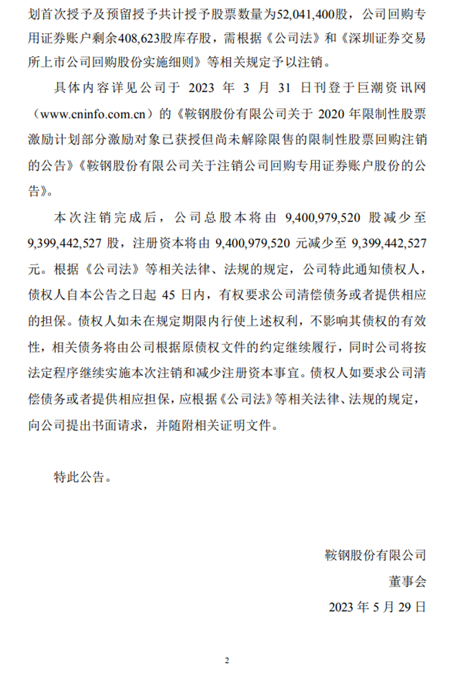 鞍鋼股份:關於回購注銷部分限製性股票及注銷公司回購專用證券賬戶股份減少注冊資本暨通知債權人的公告