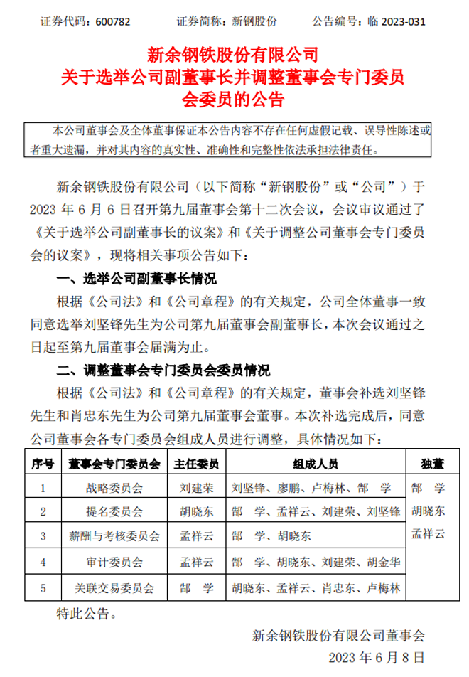 新鋼股份:新鋼股份關於選舉公司副董事長並調整董事會專門委員會委員的公告