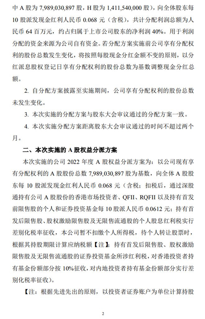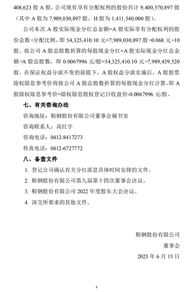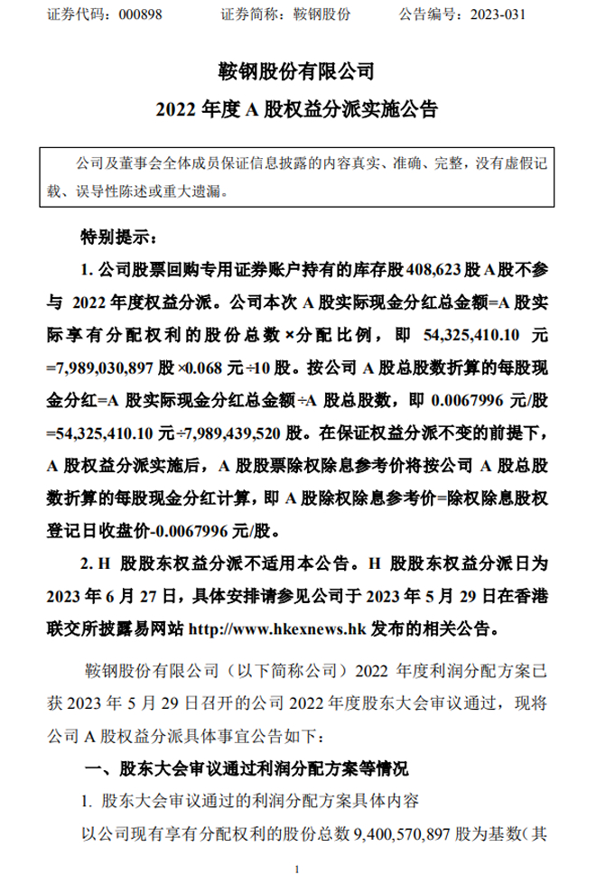 鞍鋼股份:鞍鋼股份2022年度A股權益分派實施公告