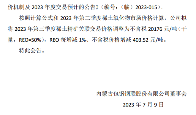 包鋼股份:包鋼股份關於2023年第三季度稀土精礦關聯交易價格調整的提示性公告