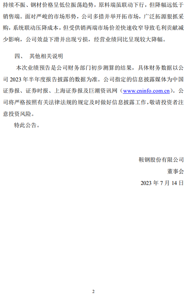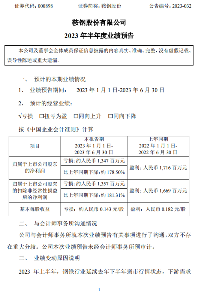 鞍鋼股份:鞍鋼股份2023年半年度業績預告