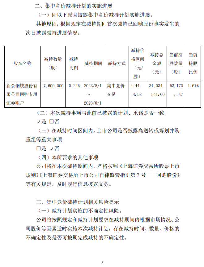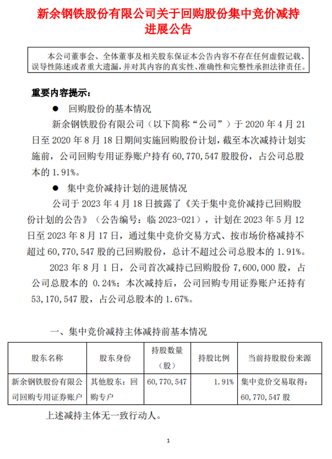 新鋼股份:新餘鋼鐵股份有限公司關於回購股份集中競價減持進展公告