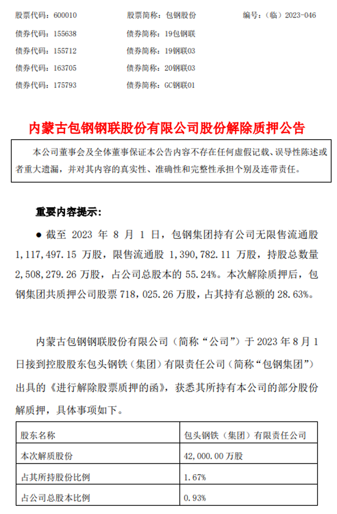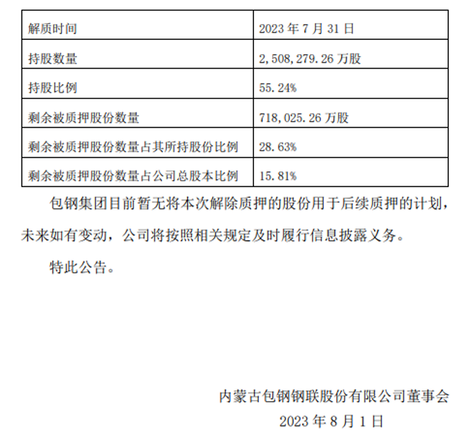 包鋼股份:包鋼股份股份解除質押公告