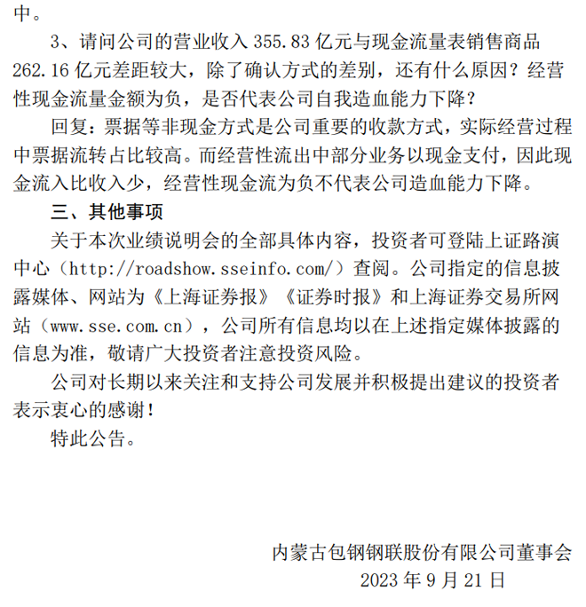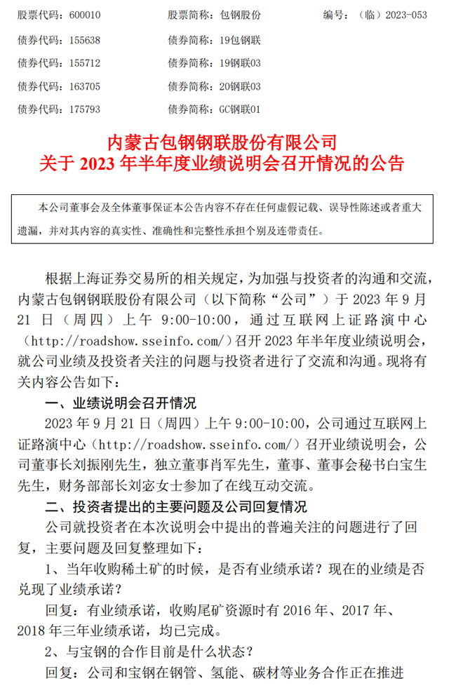 包鋼股份:包鋼股份關於2023年半年度業績說明會召開情況的公告