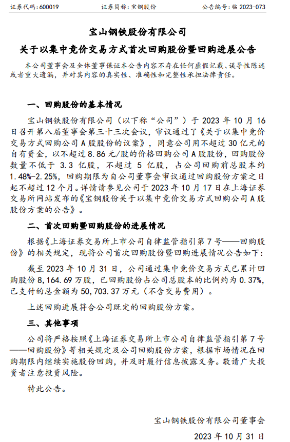 寶鋼股份:寶鋼股份關於以集中競價交易方式首次回購股份暨回購進展公告