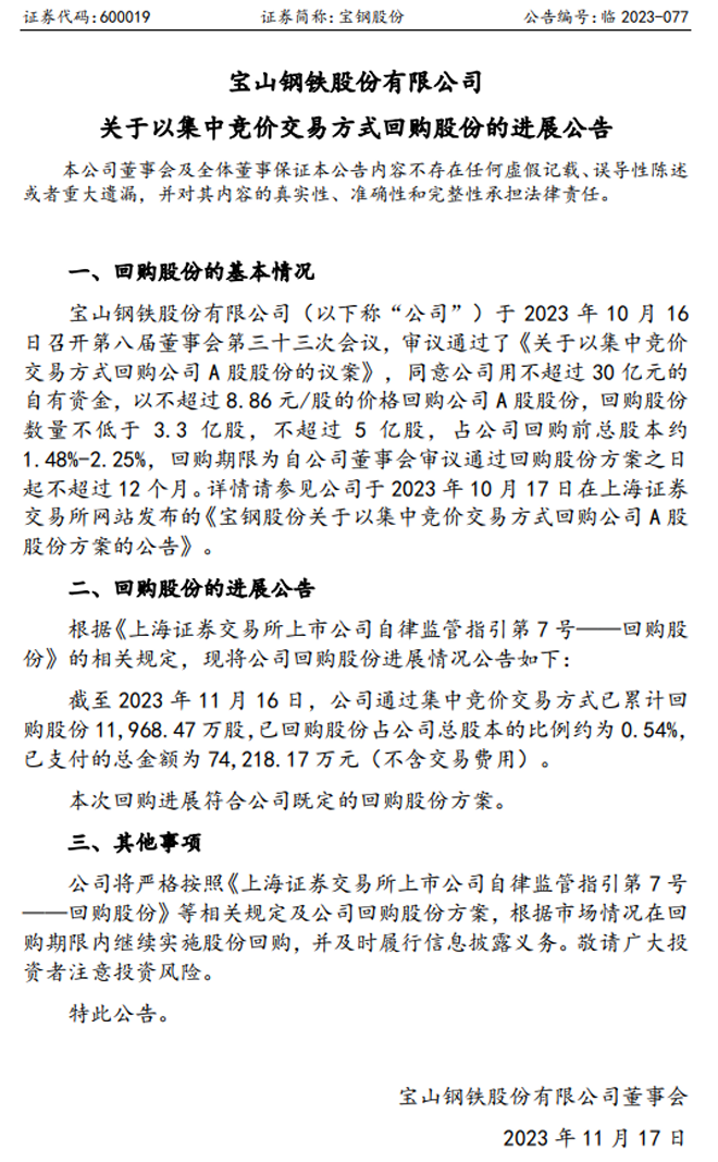 寶鋼股份:寶鋼股份關於以集中競價交易方式回購股份的進展公告