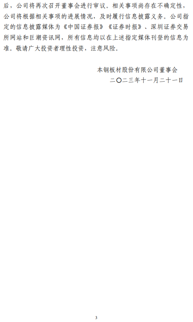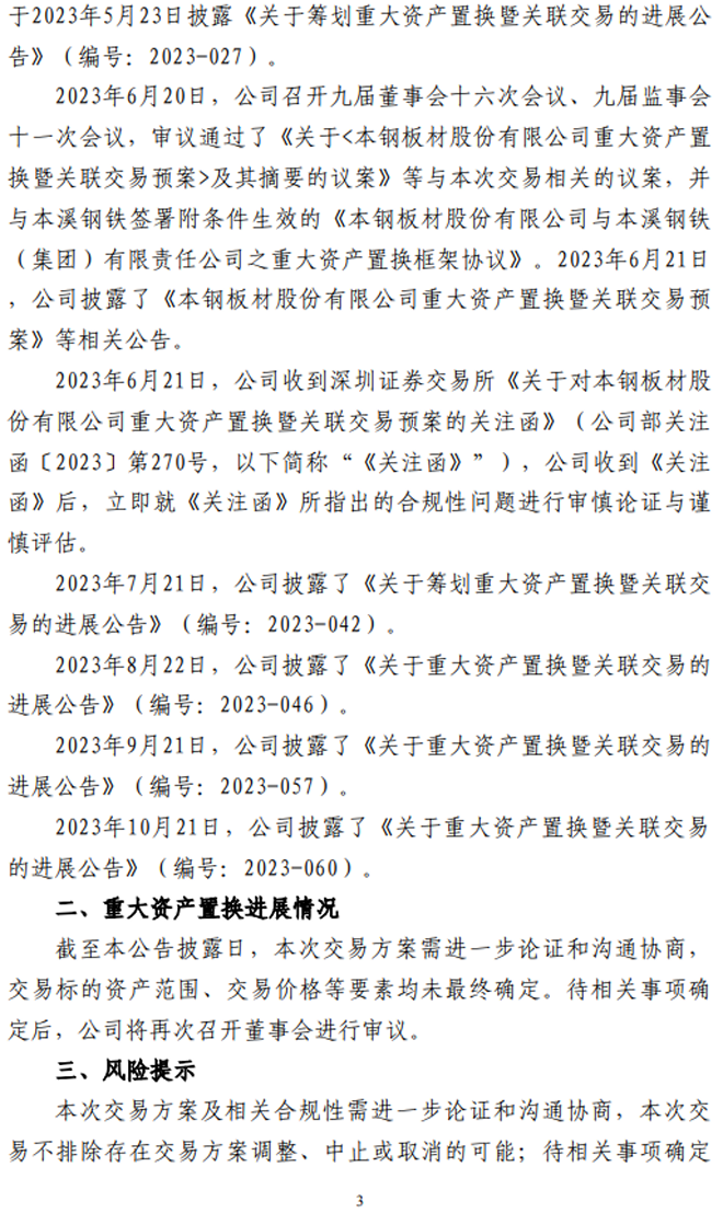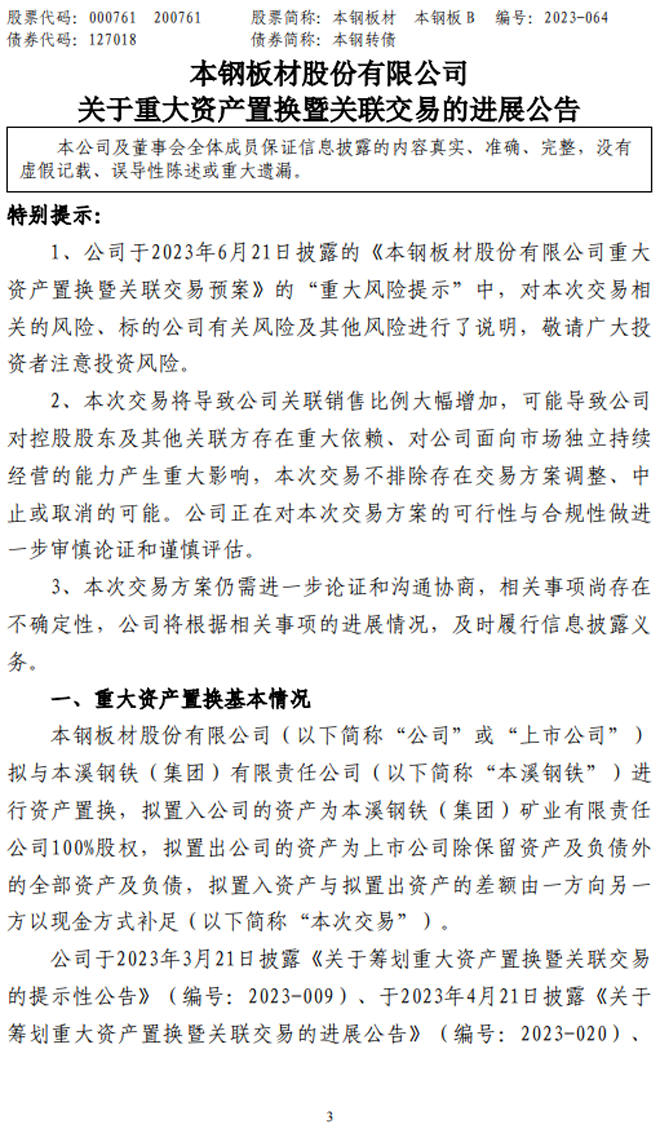 本鋼板材:本鋼板材股份有限公司關於重大資產置換暨關聯交易的進展公告