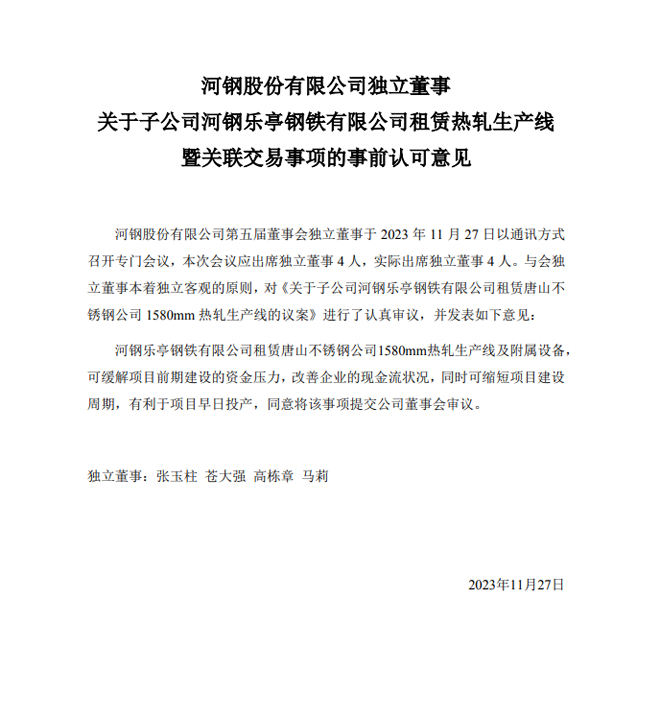 河鋼股份:獨立董事關於子公司河鋼樂亭鋼鐵有限公司租賃熱軋生產線暨關聯交易事項的事前認可意見