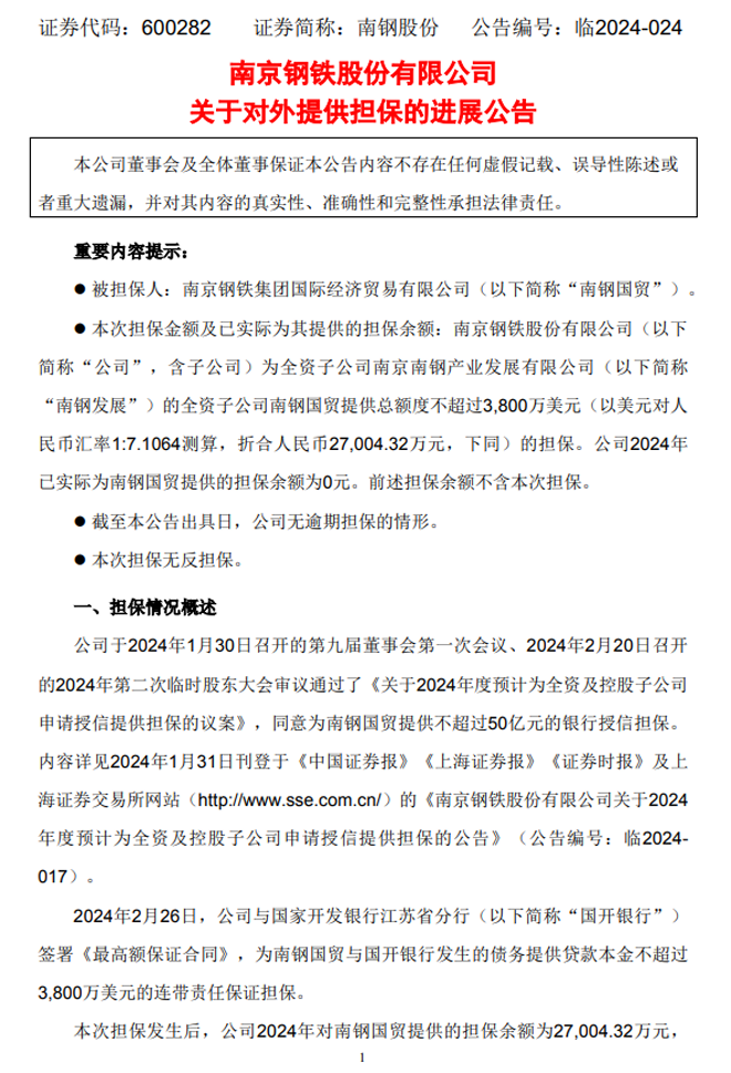 南鋼股份:南京鋼鐵股份有限公司關於對外提供擔保的進展公告