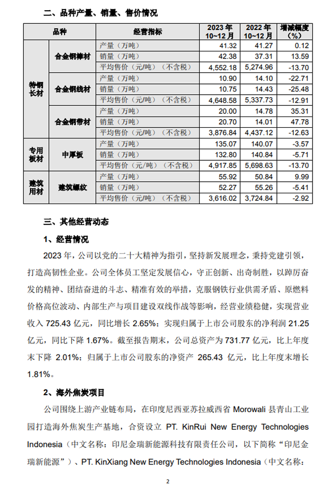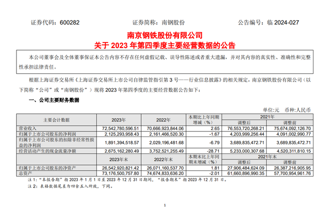 南鋼股份:南京鋼鐵股份有限公司關於2023年第四季度主要經營數據的公告