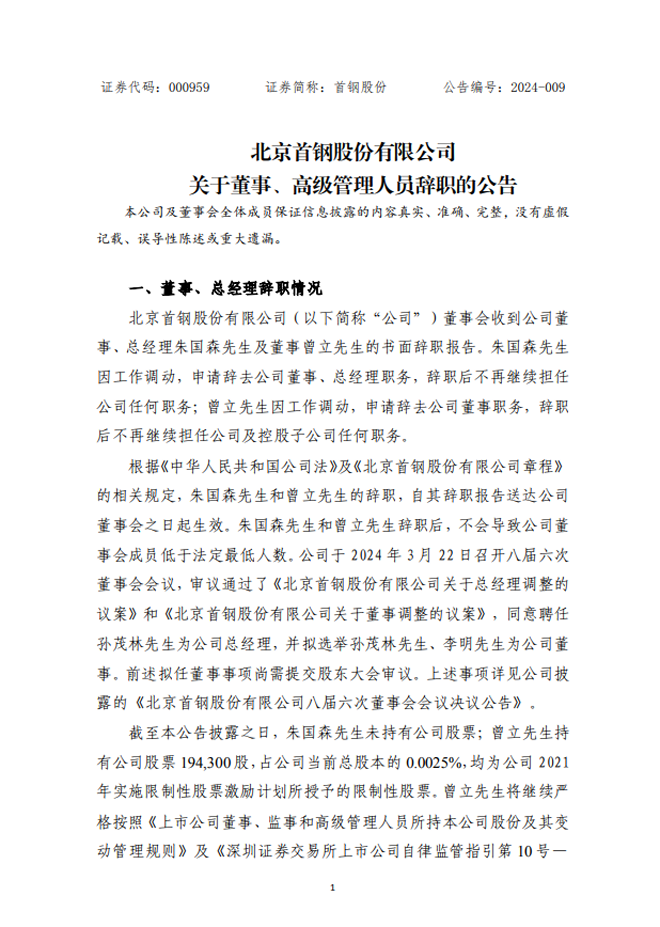 首鋼股份:北京首鋼股份有限公司關於董事、高級管理人員辭職的公告