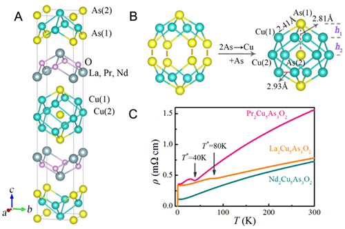 圖1. RE 2 Cu 5 As 3 O 2 的晶體結構和電阻率隨溫度的變化曲線。