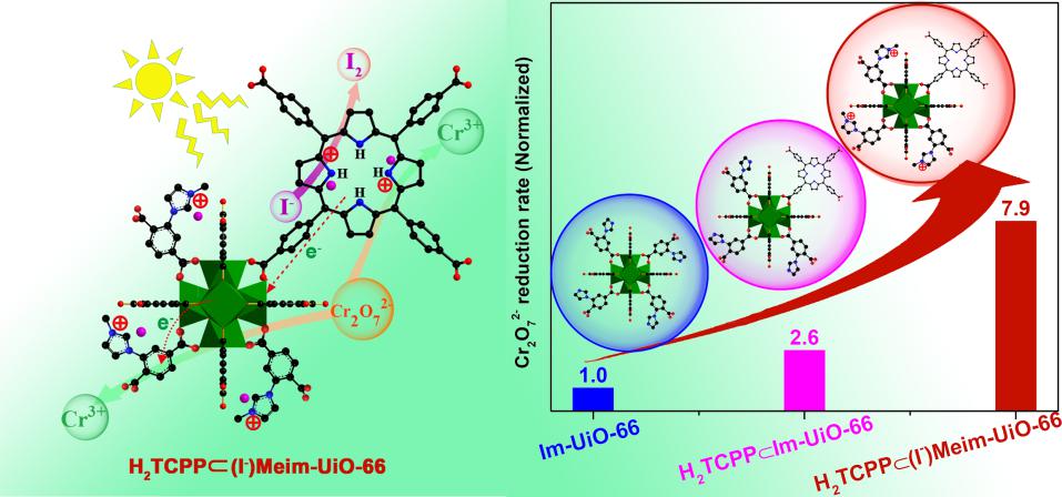 近日,中國科學院福建物質結構研究所結構化學國家重點實驗室曹榮和黃遠標團隊在科技部重點研發計劃、國家自然科學基金項目、中科院戰略性先導科技專項、前沿科學重點研究項目及中科院青促會優秀會員項目、國家留學基金委資助下,與日本國立材料研究所教授葉金花合作,將卟啉單元插入到穩定的陽離子型多元MOF材料H2TCPP(I-)Meim-UiO-66中,由於該材料集寬可見光吸收能力的卟啉單元和強Cr2O72-吸附能力的陽離子結構於一體,有效地提高了Cr2O72-的光還原能力,並達到了MOF基材料可見光還原Cr2O72-的最高速率(13.3mgCr(VI)/gcatalyst/min),遠高於傳統MOF光催化劑,包括NH2-UiO-66(0.2mgCr(VI)/gcatalyst/min)和NH2-MIL-125(1.6 mgCr(VI)/gcatalyst/min)。結合實驗表征和理論計算,作者提出了多元H2TCPP(I-)Meim-UiO-66對Cr2O72-的光還原機理。此工作表明,充分利用多元MOF中吸附和光敏性間的協同作用,可以有效提高光催化性能,並為設計更加高效的光催化材料鋪平了道路。上述結果發表在Applied Catalysis B: Environmental上(2019, 253, 323-330),文章第一作者是在讀博士研究生王旭生。