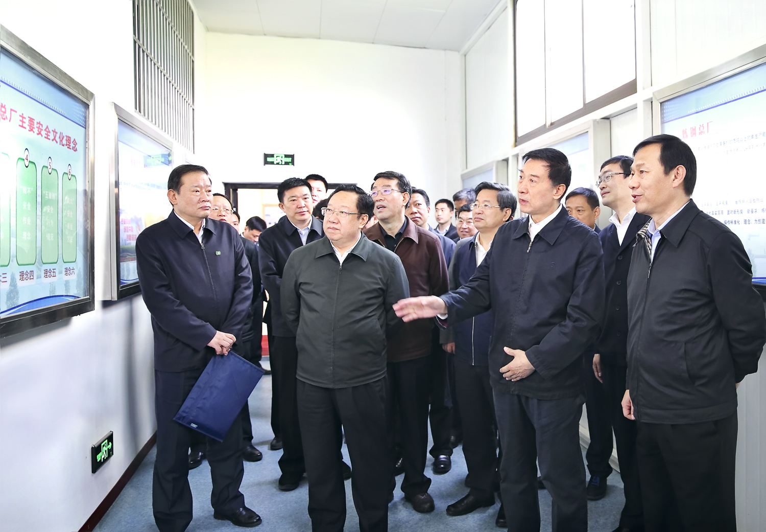 4月13日,國務委員王勇(前排右二)在湖北省委副書記、省長王曉東(前排左二)等領導陪同下,來到寶武集團武鋼有限公司調研考察安全生產工作。寶武集團黨委書記、董事長馬國強(前排右一)等陪同考察。圖為王勇在武鋼有限公司煉鋼廠四煉鋼文化展示長廊邊走邊看,對煉鋼廠全員參與的安全文化理念表示肯定。(記者 朱旺春 通訊員 王友農 張運學 攝)