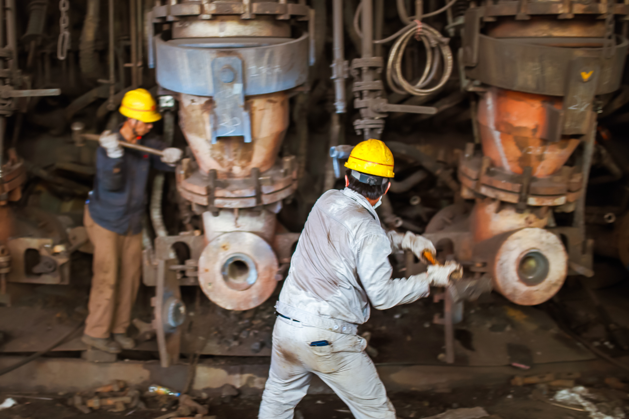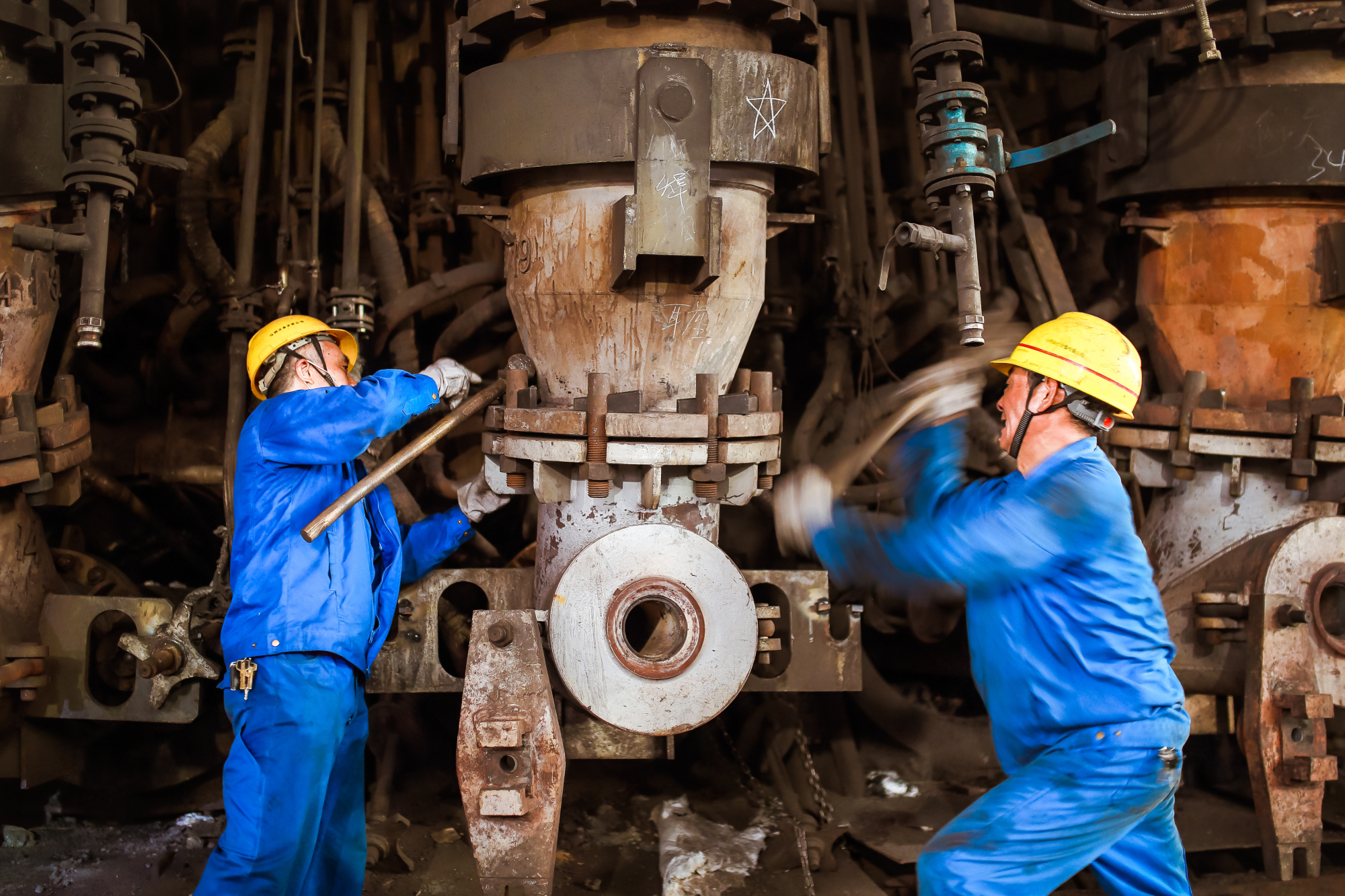圖為7月14日上午8時,職工們齊聚A座高爐風口平台,在叉車的配合下,揮舞大錘,將風口安裝到位
