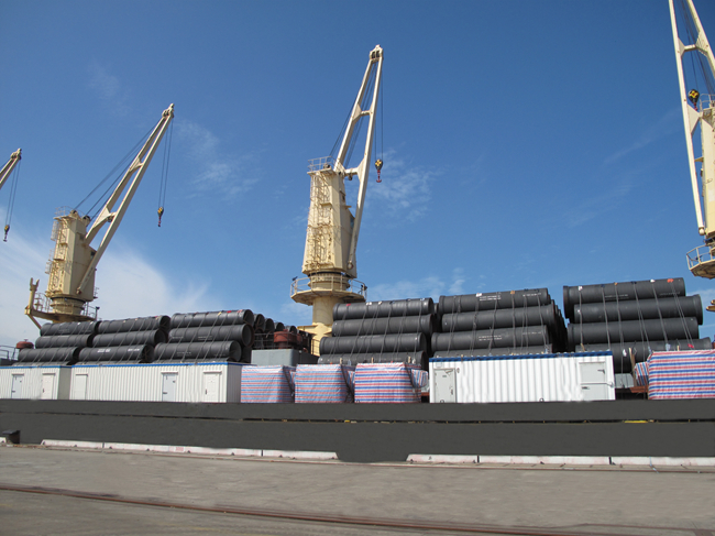 本鋼北營鑄管公司堅持品種創新、創效,“以特製勝、以特創效、以特促銷”的戰略,截至10月份,該公司新開發的“T”型接口DN2400、DN2600管,內自錨DN900、DN1800管處於鑄管行業領先水平,新特品種銷量比去年同期提高了10%,取得了較好的經濟效益。圖為在港口已經裝船待發的“本鋼牌”鑄管。(記者 錢振德 實習記者 那麗 攝)