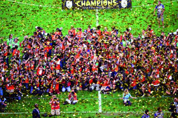 2014年7月12日,來自世界各地的記者們在裏約熱內盧拍攝獲得巴西世界杯冠軍的德國隊。(作者:劉占坤)