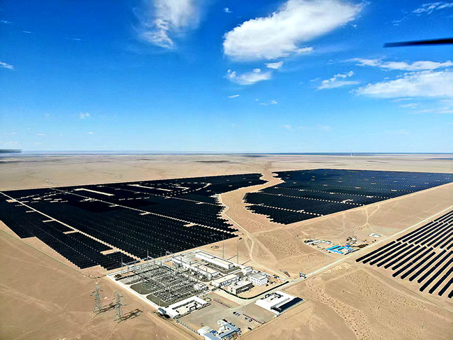 4月15日,酒鋼集團智慧電網及新能源就地消納示範項目金塔白水泉二期400兆瓦光伏發電工程俯瞰(如 圖)。該項目光伏組件采用575Wp(峰值瓦特)N型單晶雙麵雙玻光伏板,正麵朝南35度傾角布置,固定式光伏支架。項目投運後,年均發電量可達7.7億千瓦時,每年可減少碳排放64萬噸。目前,酒鋼宏晟電熱公司強化設備精細運維,優化生產經營組織,促使工程實現安全、穩定、高效運行。(亓傑 攝)