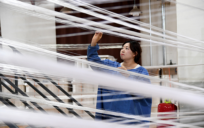 5月18日是第35個全國助殘日,今年助殘日的活動主題是“弘揚自強 與助殘精神,凝聚團結奮進力量”。多年以來,中國寶武太鋼始終高度重視殘疾人事業,積極探索殘疾人就業新模式、新路徑。太鋼福達公司(原太鋼福利廠)自1984年成立以來,已累計安置近1100多名殘疾人就業。太鋼福達公司被山西省殘疾人聯合會命名為全省首批“殘疾人就業創業”基地。圖為5月14日,太鋼福達公司職工在進行工業用吊帶生產作業。(記者 王旭宏 攝)