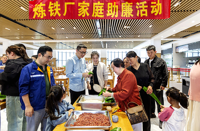 5月26日,在端午節來臨之際,中國寶武馬鋼煉鐵廠組織各級管理人員、先進模範代表及其家屬近50人開展豐富多彩的職工家庭參觀交流活動。此次活動包括觀看警示教育短視頻、職工家屬簽訂廉潔承諾書、為職工家屬準備廉潔文化文創小禮物、包粽子等廉潔從業教育環節,提醒大家守住“幸福門”,築牢“內防線”,穩住“大後方”,發揮好家風助力,構建風清氣正的工作環境。圖為包粽子活動現場。(特約通訊員 章隆勝 攝)