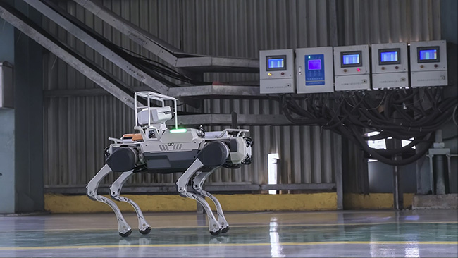 7月20日,一個名為“寧小鐵”的四足機器人正邁著穩健的步伐在杭鋼集團寧波鋼鐵高爐區域穿梭,它是這裏最新上崗的“巡檢哨兵”(如圖)。該機器人是寧波鋼鐵聯合杭州“六小龍”之一的杭州雲深處科技有限公司打造的首個以高爐風口平台為核心應用場景的智能巡檢四足機器人。該機器人通過激光反射定位技術,可實現7×24小時的不間斷值守,徹底消除人工巡檢可能出現的疲勞盲區。此外,“寧小鐵”借助其搭載的32位雙核 5G模塊和廠區室內外全覆蓋的5G專網,能將感知數據實現毫秒級回傳,通過深度學習算法對這些數據進行分析處理,將傳統依賴經驗判斷的巡檢,升級為可量化、可追溯的數字診斷,成功構建了“感知—傳輸—分析—決策”的全鏈路技術體係。(陳曉明 攝)
