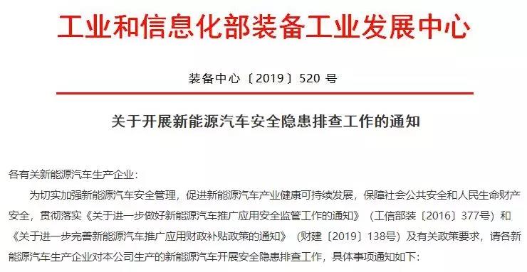 這是自去年9月先後印發《關於開展新能源客車安全隱患專項排查工作的通知》和《關於開展新能源乘用車、載貨汽車安全隱患 專項排查工作的通知》以來,工信部下發的第三份關於新能源汽車安全隱患排查的文件。