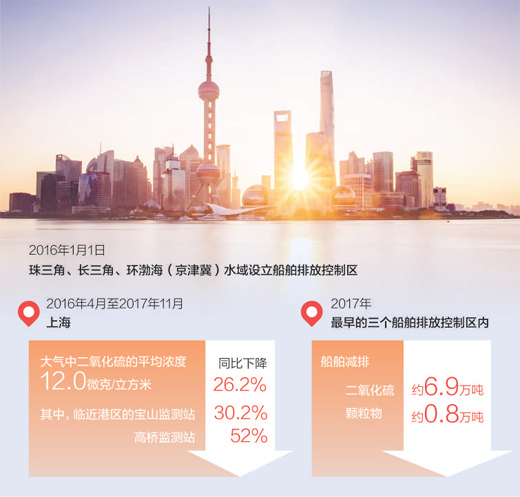 限硫帶來了空氣質量的持續向好。在上海,2016年4月至2017年11月期間,大氣中二氧化硫的平均濃度為12.0微克/立方米,同比下降26.2%。其中,臨近港區的寶山監測站、高橋監測站的二氧化硫濃度同比分別下降30.2%、52%。深圳東部港區、京唐港等控製區內的監測數據也顯示,港口硫氧化物降幅十分明顯。