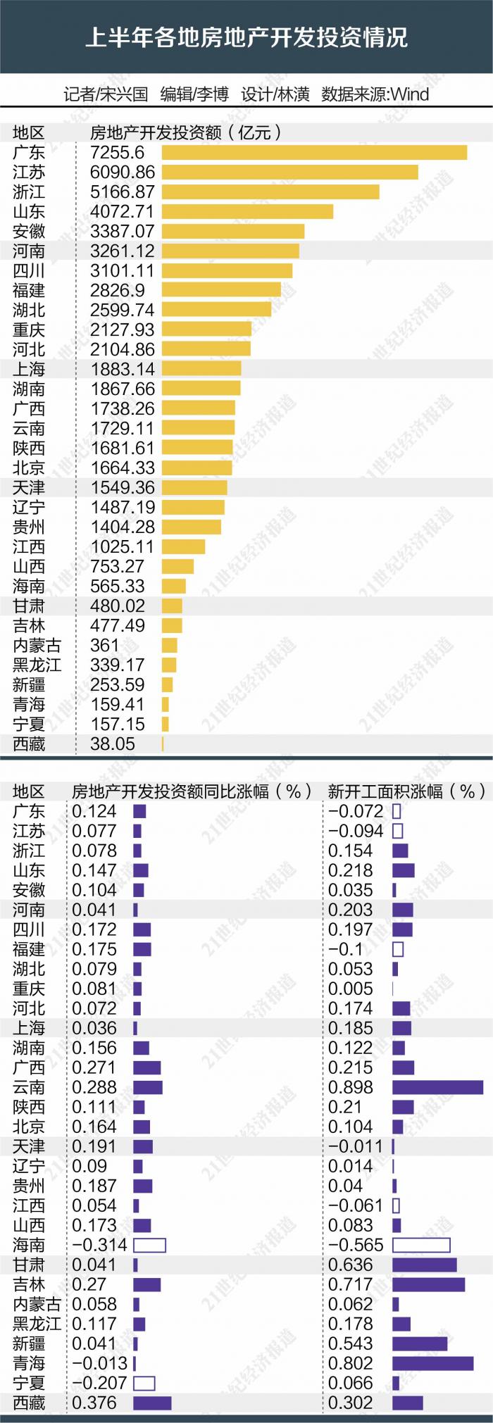 21世紀經濟報道記者整理各地陸續發布的上半年房地產投資數據發現,不僅青海、寧夏、海南等中西部地區已經出現了房地產投資負增長,在31個省、市、自治區中,有19個都出現了投資增速下滑的狀況,其中也包括廣東、山東等總體投資額排名靠前的省份。