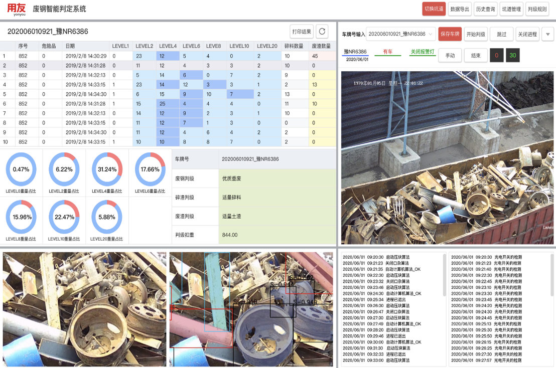 目前用友BIP工業大腦的“廢鋼判級”服務已擁有標準的廢鋼數據庫及10餘種成熟的智能算法模型,可應用於廢鋼檢驗遠程監控、廢鋼智能判級、扣雜數量智能判定、危險物報警、超大尺寸廢鋼報警、油汙提醒、廢鋼種類分析等,全程精準高效,檢測結果公平公正。首發的移動式卸料技術和壓塊檢測技術,解決行業難題,引領行業發展。