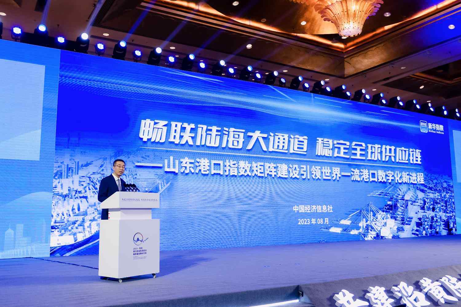 圖為中國經濟信息社指數事業部主任曹占忠發布解讀《新華·山東港口大宗商品指數年度運行報告(2023)》。