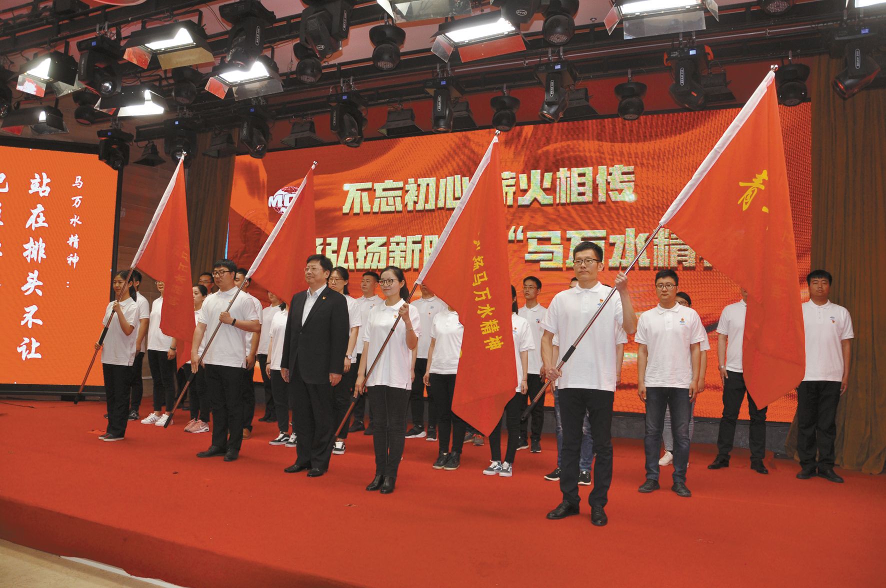 在活動儀式上,中國華冶黨委副書記、總zong經jing理li周zhou誌zhi軍jun致zhi辭ci,代dai表biao中zhong國guo華hua冶ye號hao召zhao紀ji念nian馬ma萬wan水shui同tong誌zhi,弘hong揚yang新xin時shi代dai馬ma萬wan水shui精jing神shen,要yao站zhan在zai新xin的de曆li史shi起qi點dian,重zhong溫wen馬ma萬wan水shui事shi跡ji,感gan悟wu實shi幹gan築zhu夢meng的de新xin時shi代dai馬ma萬wan水shui精jing神shen,學xue習xi他ta忠zhong誠cheng愛ai國guo愛ai黨dang的de崇chong高gao思si想xiang,學xue習xi他ta對dui工gong作zuo兢jing兢jing業ye業ye、埋頭苦幹的實幹精神,學習他“站在排頭不讓,把住紅旗不放”的奮勇爭先精神,學習他鑽研技術,刻苦攻關的創新精神。邯鄲市總工會黨組書記、常務副主席王利偉講話,祝願中國華冶在中國五礦、中冶集團的堅強領導下,傳承和弘揚“站在排頭不讓,把住紅旗不放”的馬萬水精神,以更大的視野,更寬闊的胸懷,在邯鄲大地再展雄風,再立新功,再創輝煌;參加活動全體人員觀看了小型紀錄片《感動中國100人物誌——馬萬水》和情景劇《鐵漢馬萬水》,無不為之感動。馬萬水英雄集體第22代擎旗人,馬萬水分公司黨委書記、經理楊俊,作了以托起馬萬水精神大旗,重振馬萬水英雄集體雄風為主題宣講。中國華冶職工、馬萬水同誌長孫馬岩為大家講述親情的力量,馬萬水精神的踐行。中國華冶黨委副書記、總經理周誌軍同誌代表公司黨委為中國華冶以馬萬水命名的青年文明號、青年突擊隊等青年團體授旗;並由中國華冶團委副書記彭雙帶領華冶青年宣誓,華冶青年不忘初心,薪火相傳,用青春和熱血與企業共成長、同發展,塑造新時代馬萬水精神,用努力和奮鬥書寫企業不斷發展壯大的宏偉藍圖。中國五礦集團工會主席劉雷雲、邯鄲市總工會黨組書記、常務副主席王利偉,邯鄲市建設黨委副書記齊衛華,中國華冶黨委副書記、總經理周誌軍,為馬萬水勞模廣場落成揭幕。馬萬水勞模廣場自此成為中國華冶、邯鄲市勞模精神、工匠精神的教育基地。