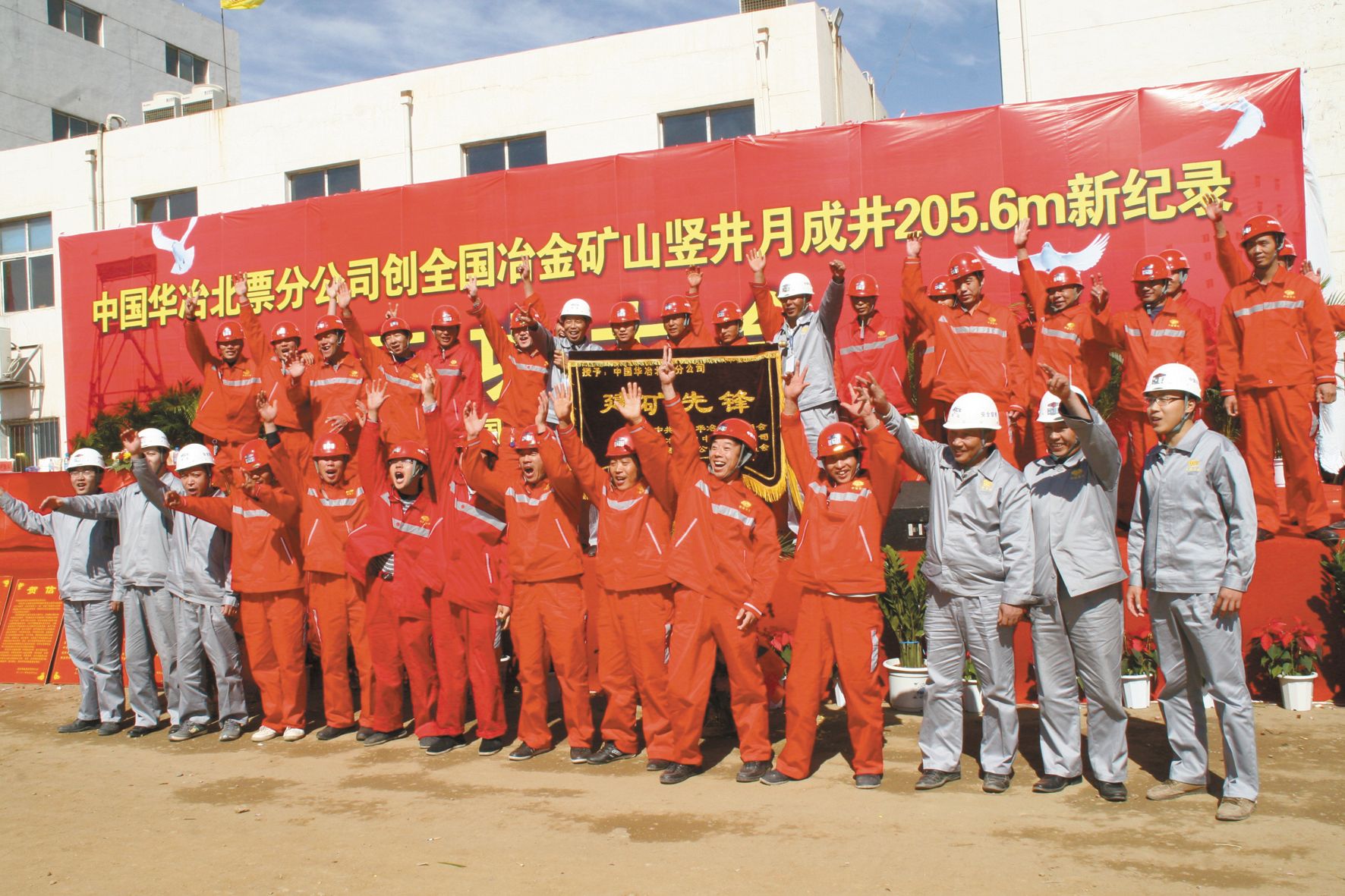 圖為中國華冶創全國冶金礦山豎井月成井新紀錄慶祝現場。
