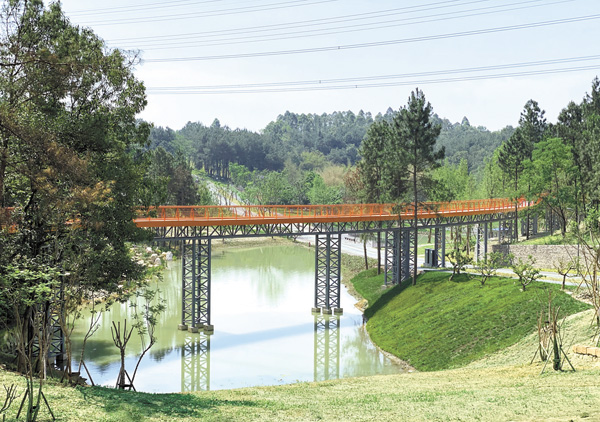 四川省設計院設計管理人員陳利表示,永安湖城市森林公園著力打造青少年生物科技科普展示場景、藝術生活體驗場景以及生物科技企業互動場景。曲灣幽穀、平湖鬆風、梯田花海、空中棧道眾多“景點”競放異彩,處處都能體現“知識+藝術+健康”的設計理念。